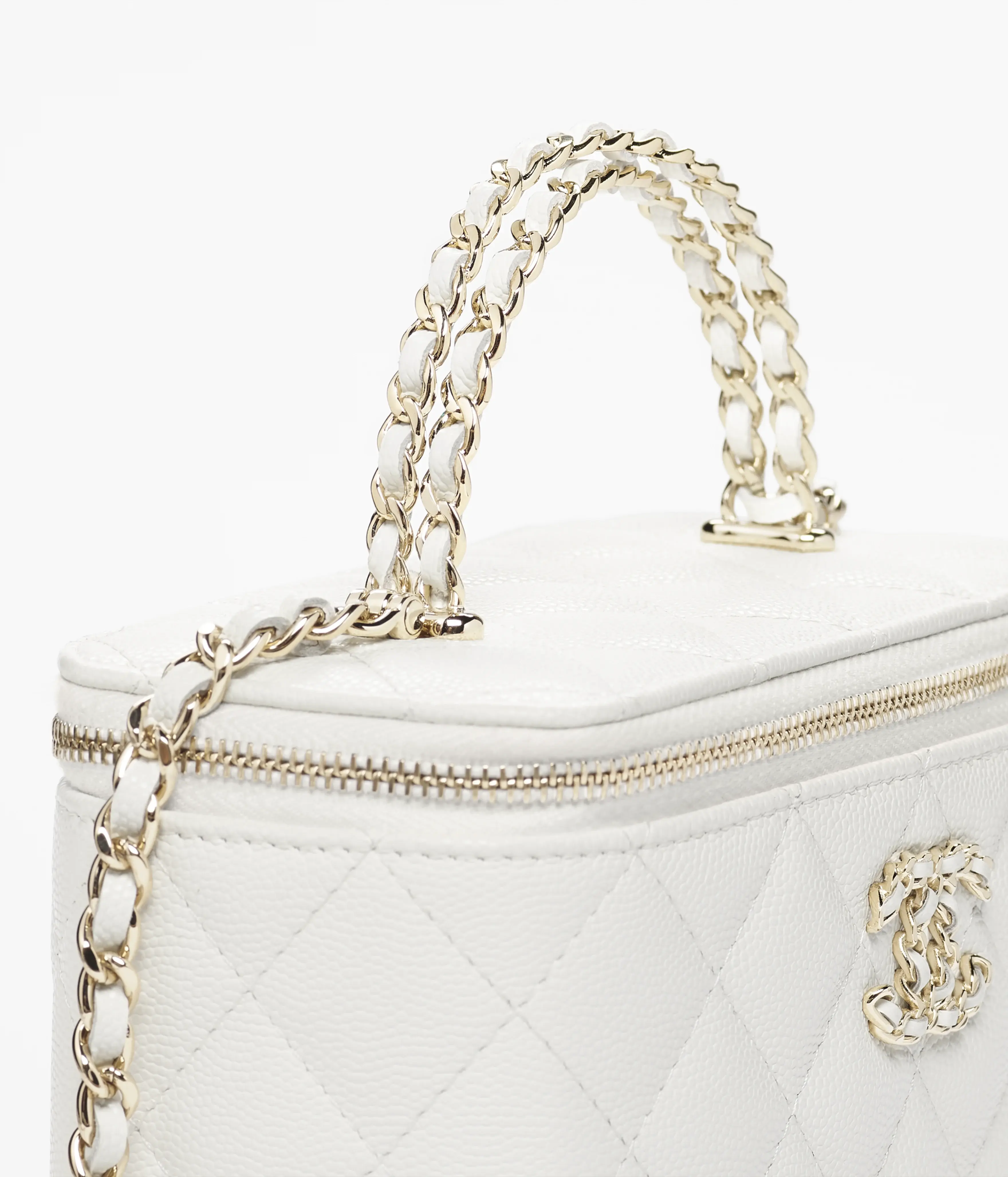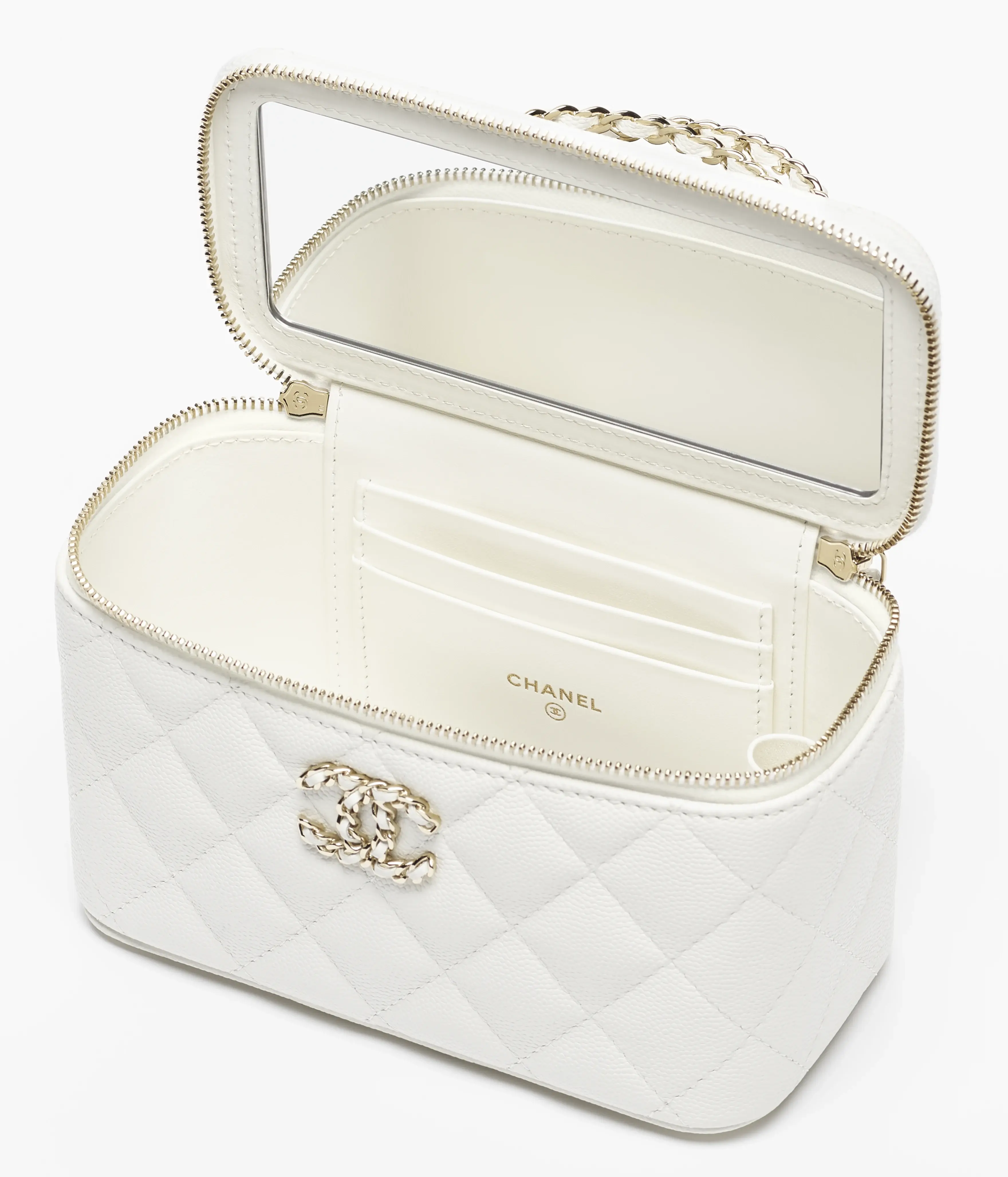 Vanity of the Spring Summer 2026 collection: Long Vanity with Chain, grained shiny calfskin & gold-tone metal, white on the CHANEL official website.