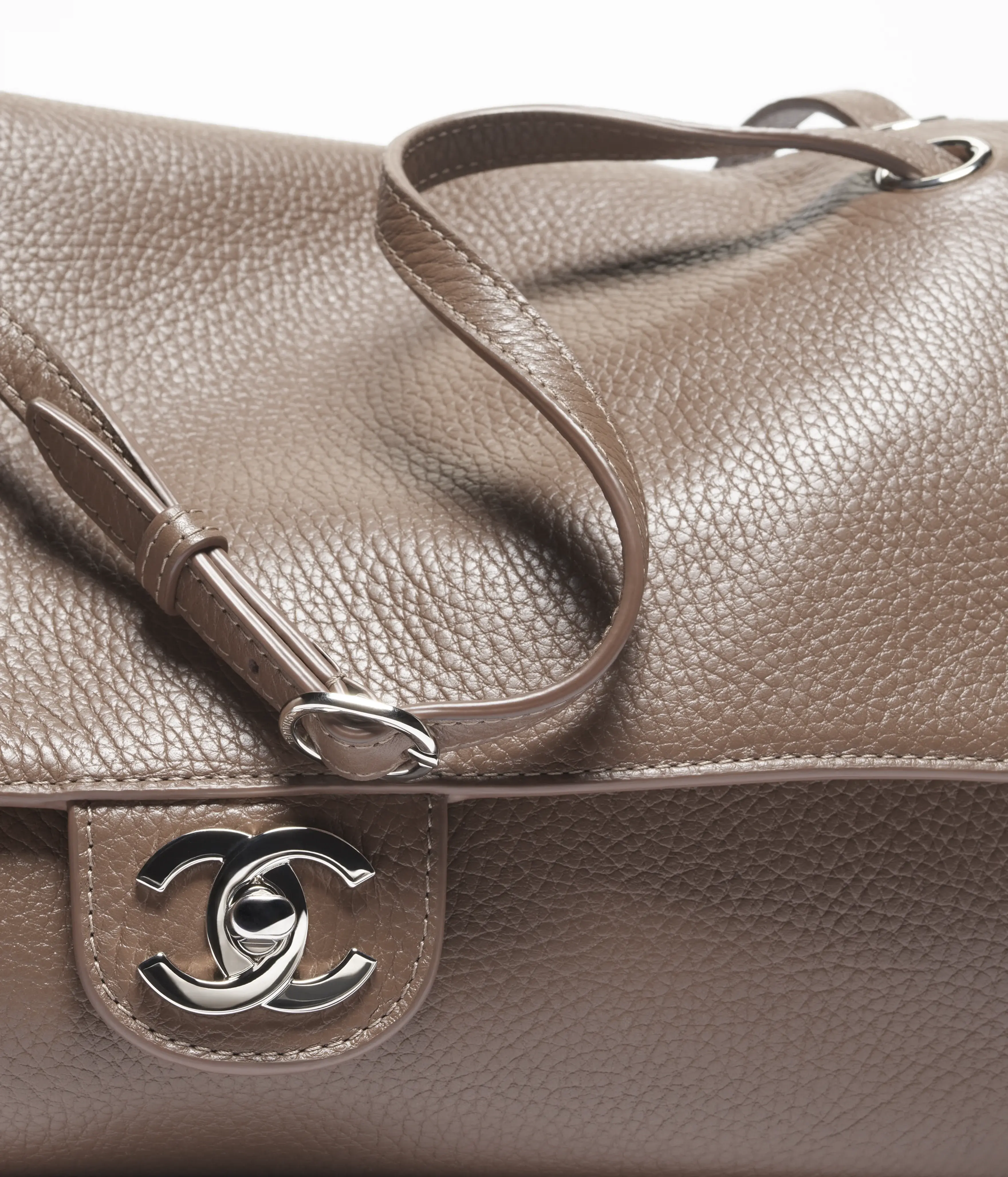 Flap Bags of the Spring Summer 2026 collection: Maxi Flapbag , grained calfskin & silver-tone metal, light brown on the CHANEL official website.