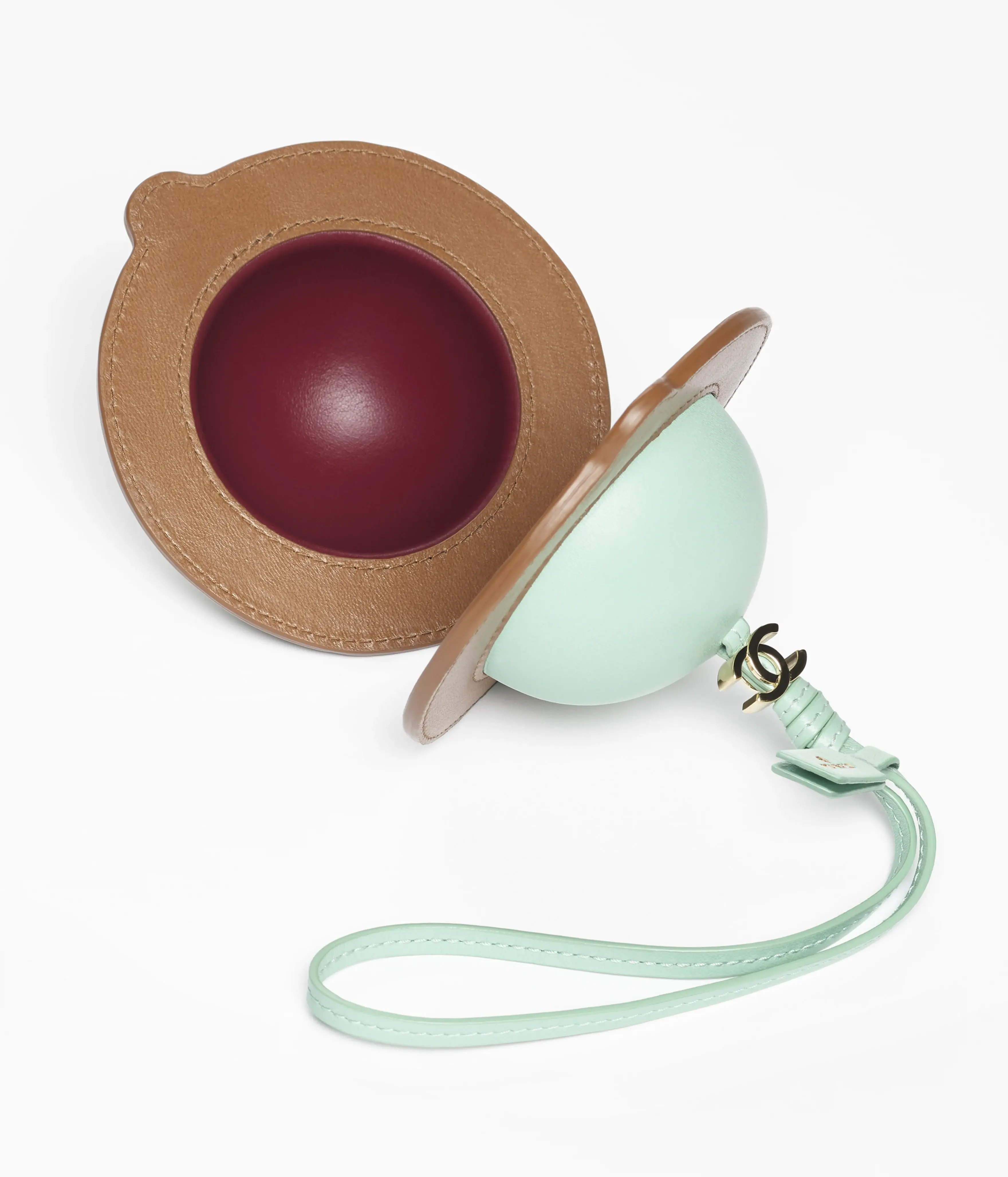 Leather accessories of the Spring Summer 2026 collection: Mini Bag Charm, lambskin & gold-tone metal, green & camel on the CHANEL official website.