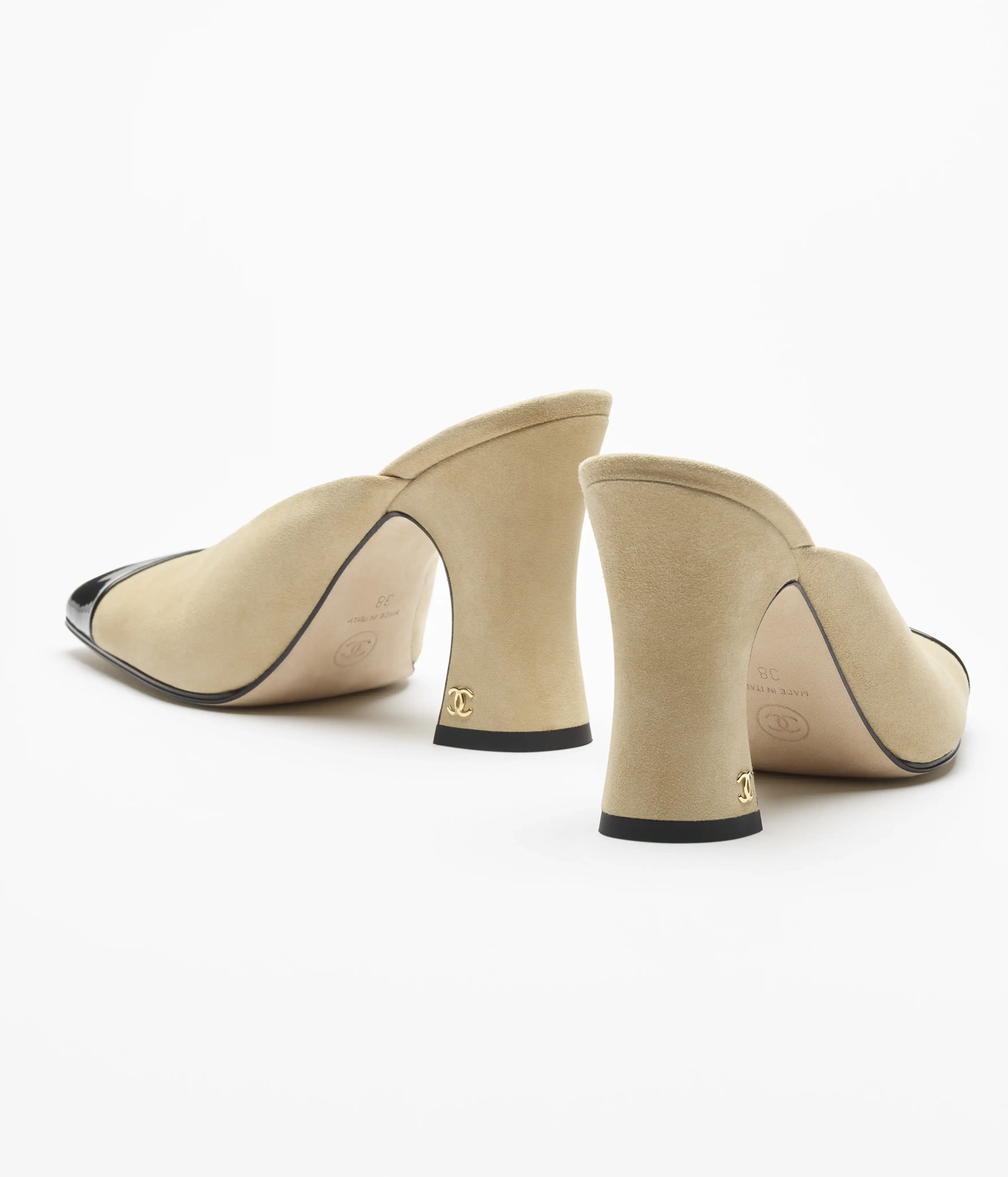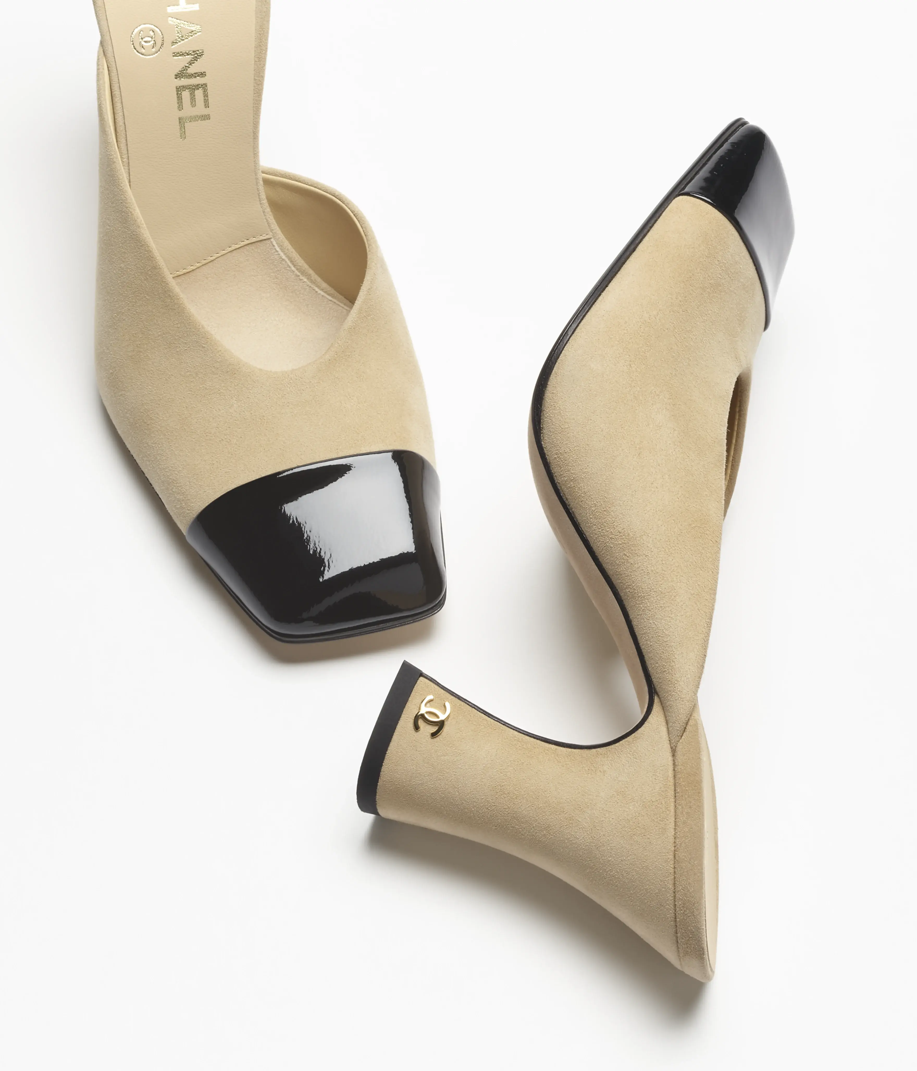 Casual Sandals of the Spring Summer 2026 collection: Mules, suede kidskin & patent calfskin, beige & black on the CHANEL official website.
