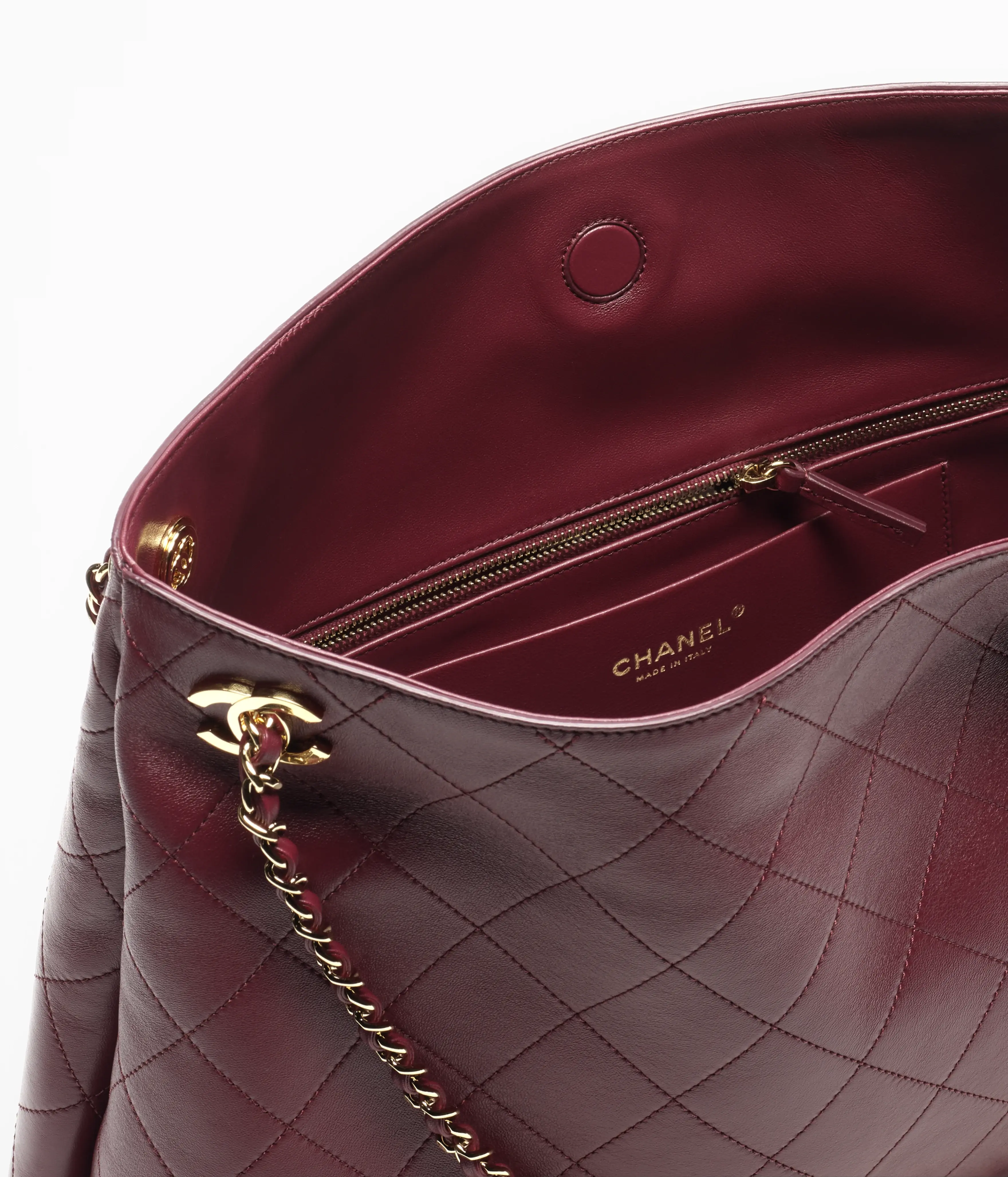 Shopping Bags of the Spring Summer 2026 collection: Shopping Bag, lambskin & gold-tone metal, burgundy on the CHANEL official website.