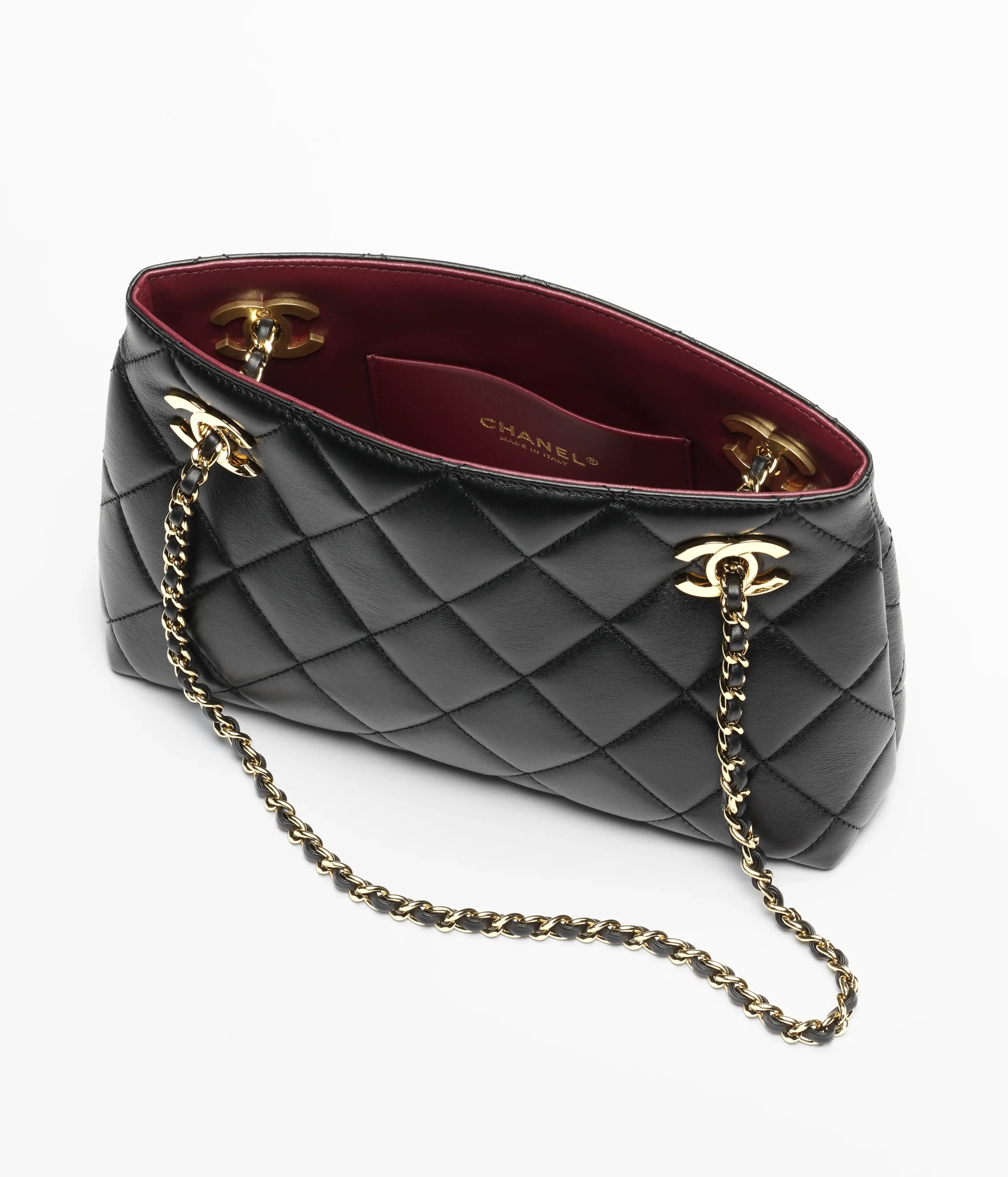 Shopping Bags of the Spring Summer 2026 collection: Small Shopping Bag, lambskin & gold-tone metal, dark burgundy on the CHANEL official website.
